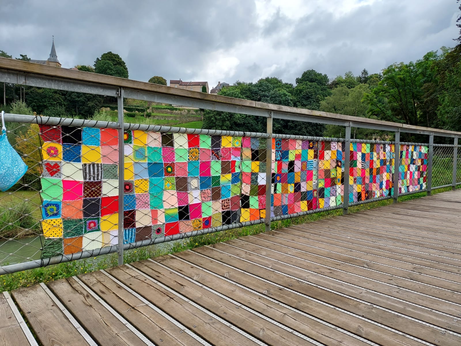 C’est quoi le yarn bombing? Il s’agit d’habiller le mobilier urbain avec de la laine sous toutes ses formes. Vous voyez cette grande passerelle au dessus du plan d’eau de la Sangsue? La tricopathe s’éveille en vous? En nous, elle s’est bien éveillée et en beaucoup d’autre dont des crochpathes. Bref, beaucoup de participantes ont confectionné des carrés de 10cm par 10 cm en laine et notre artiste @lespoesiesdemahia s’est chargée du projet assemblage et accrochage. Voici le résultat de la première partie!