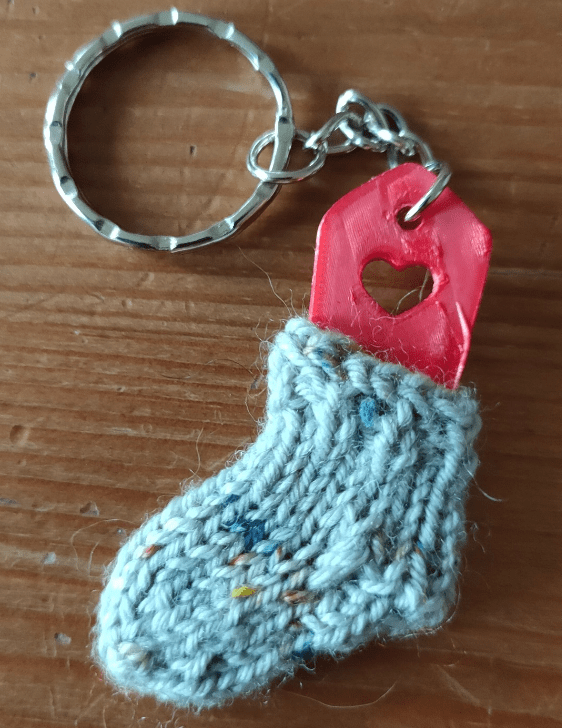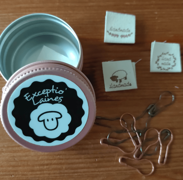 Des gobelets (1€) et des tote bags (10€) dans diverses couleurs ainsi que des badges (3€) comme l’an dernier, mais aussi des petites boites au logo du festival contenants des labels à coudre et des marqueurs ampoules (10€), des crochets remailleurs ( 1€ et parfaits quand une maille se sauve) et deux sortes de porte clefs dans de nombreuses couleurs en forme de bloqueur à chaussette que nous vous proposerons d’acheter avec sa petite chaussette ou avec le patron pour la personnaliser (5€).